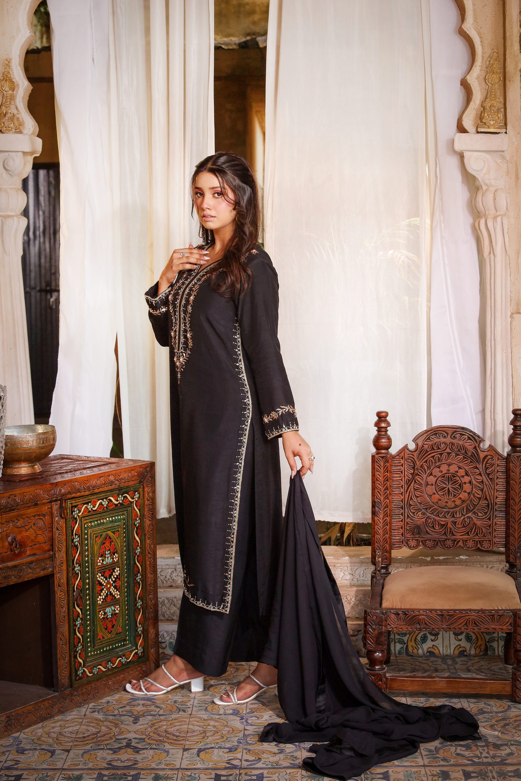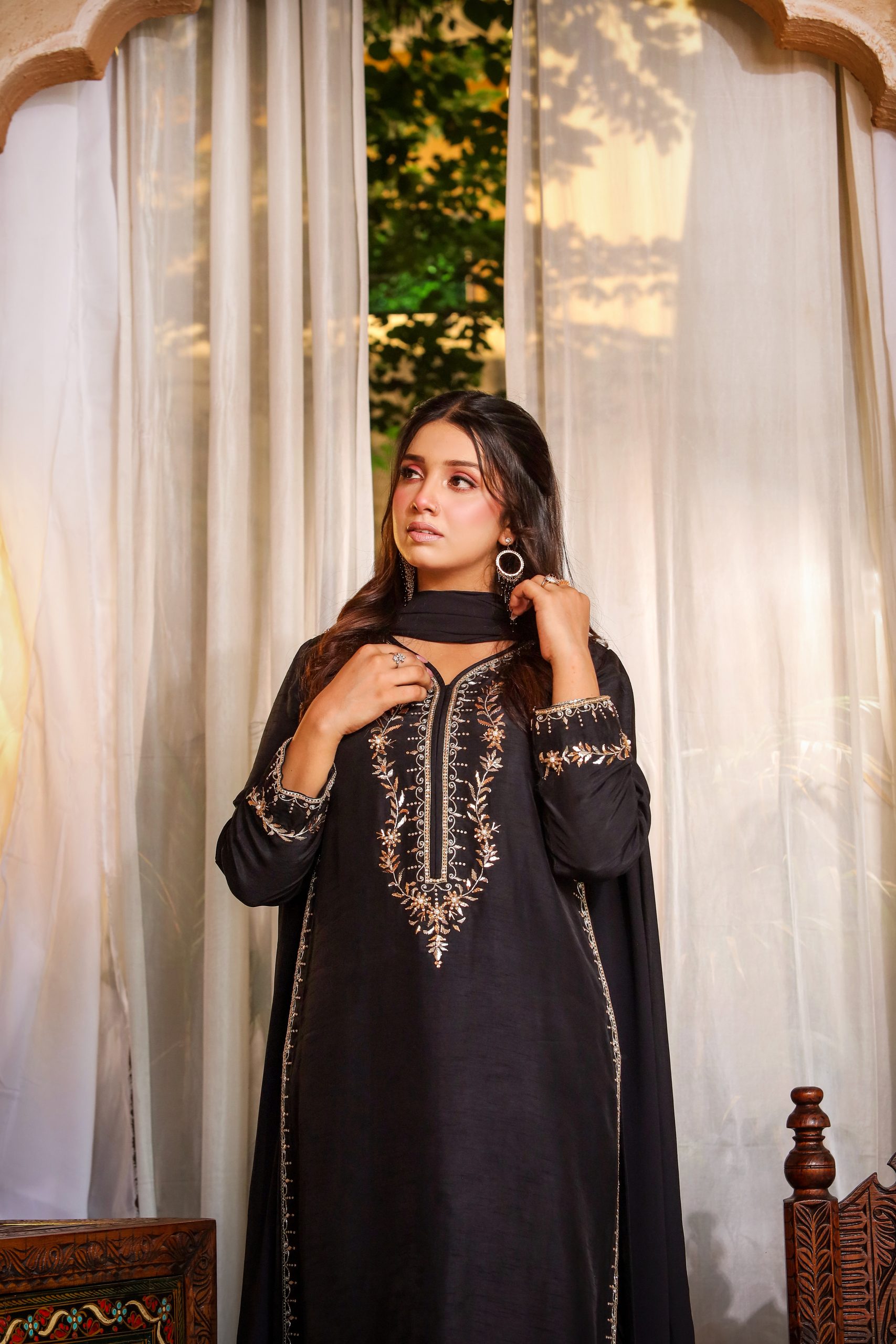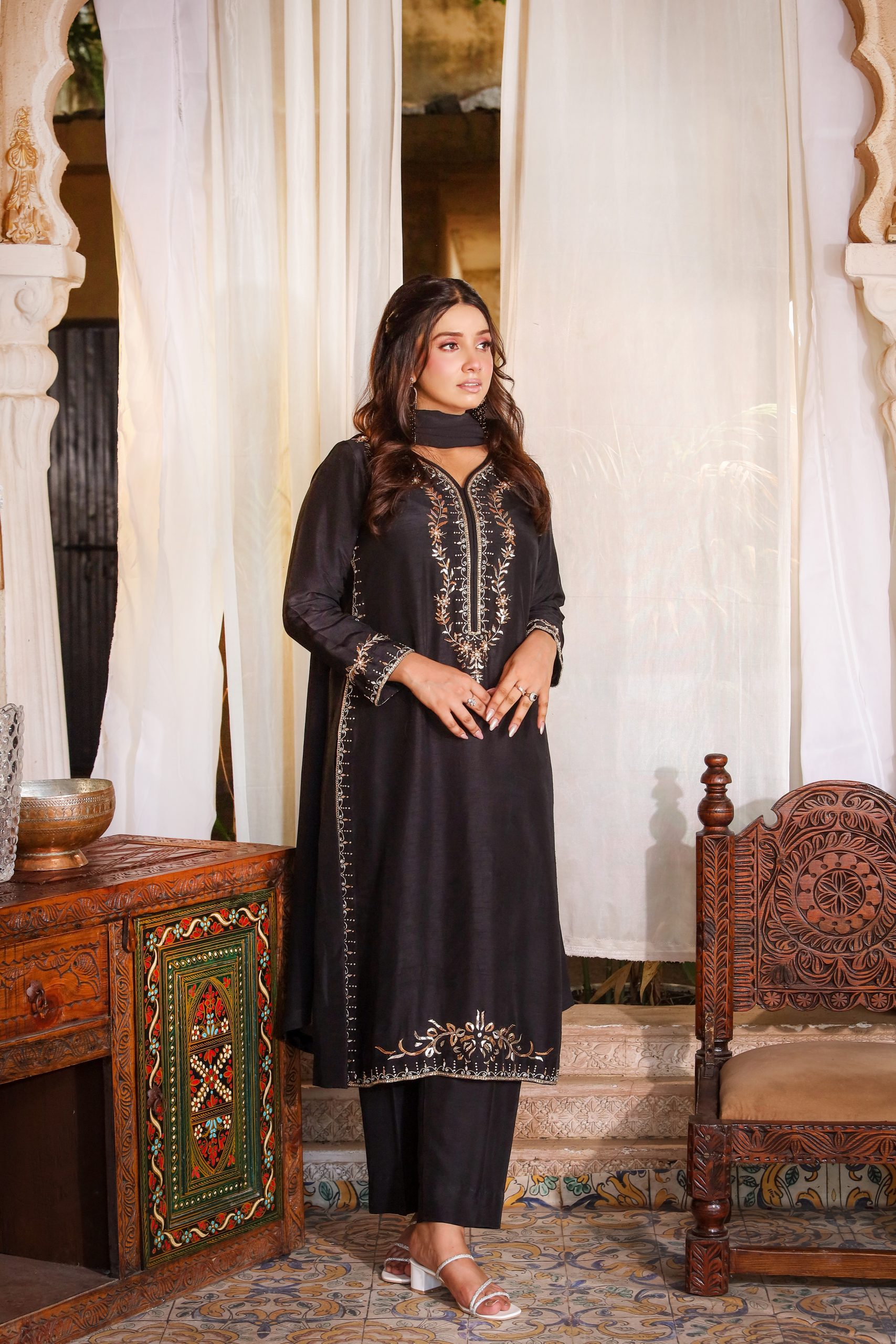 A luxurious Pure Korean Raw Silk 3-piece suit, handcrafted with exquisite Ada work and elegant Mukesh detailing, completed with a pure silk dupatta.