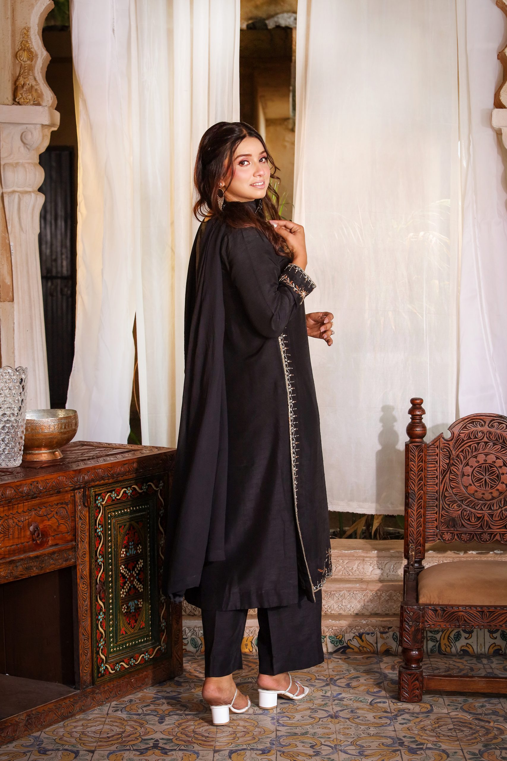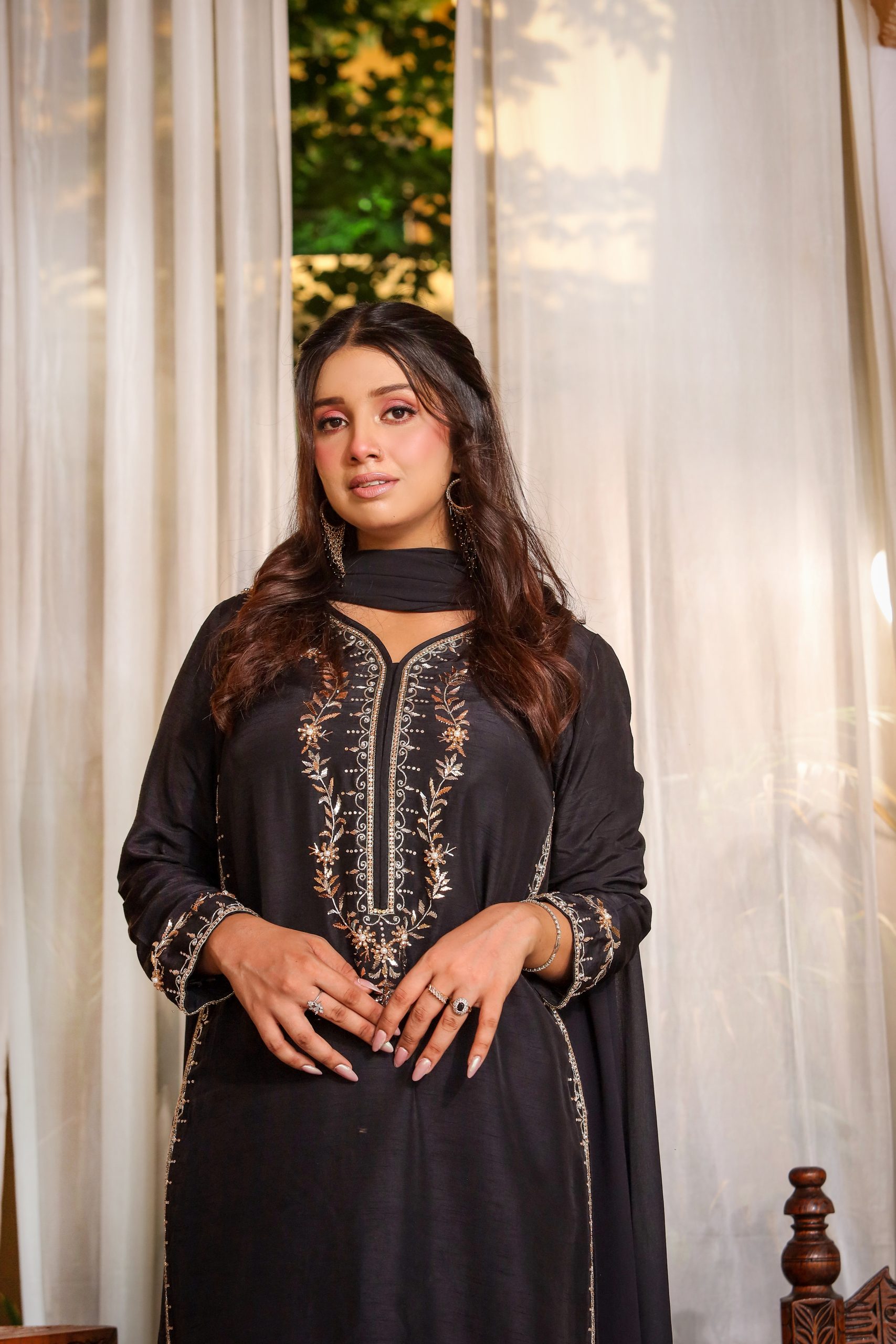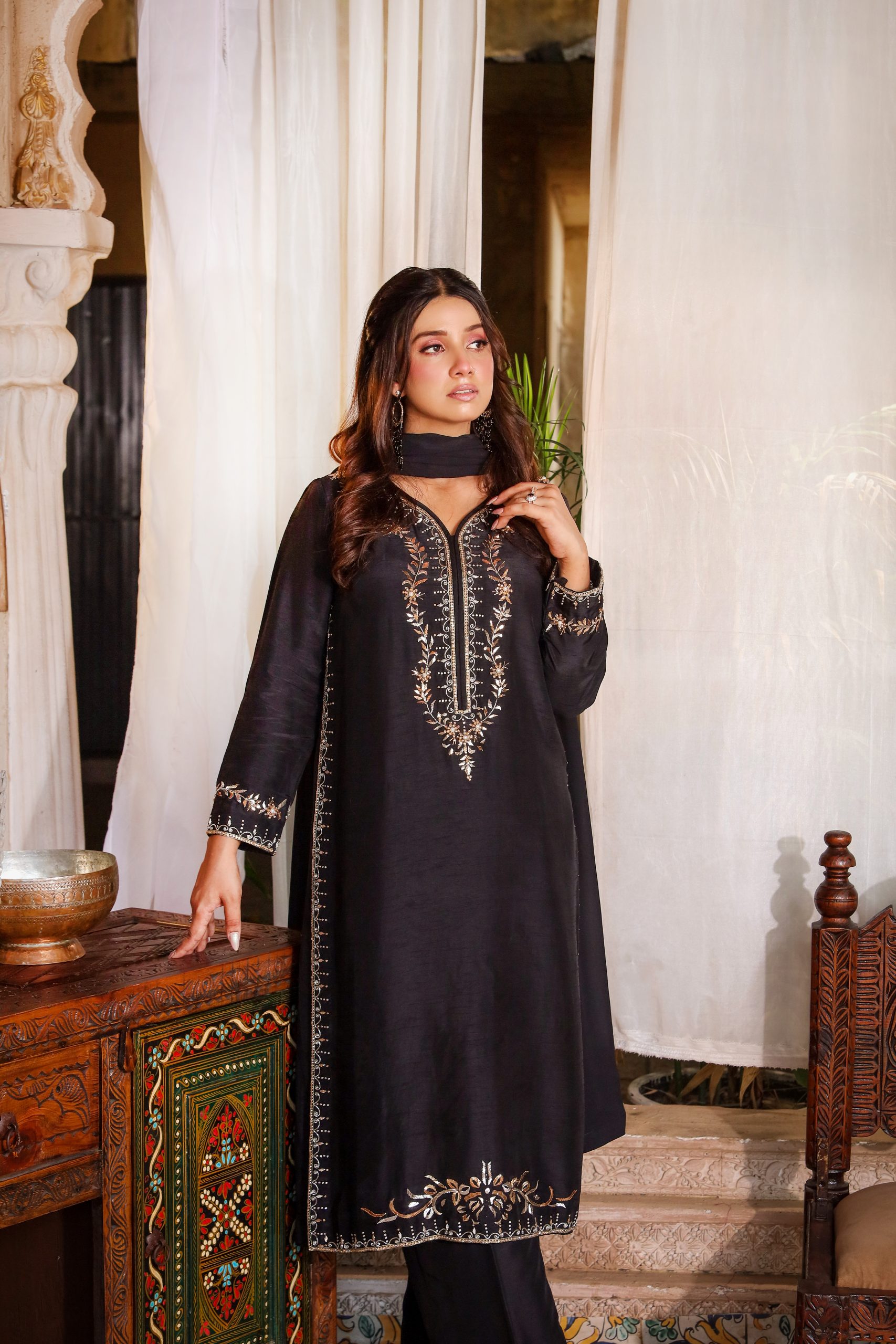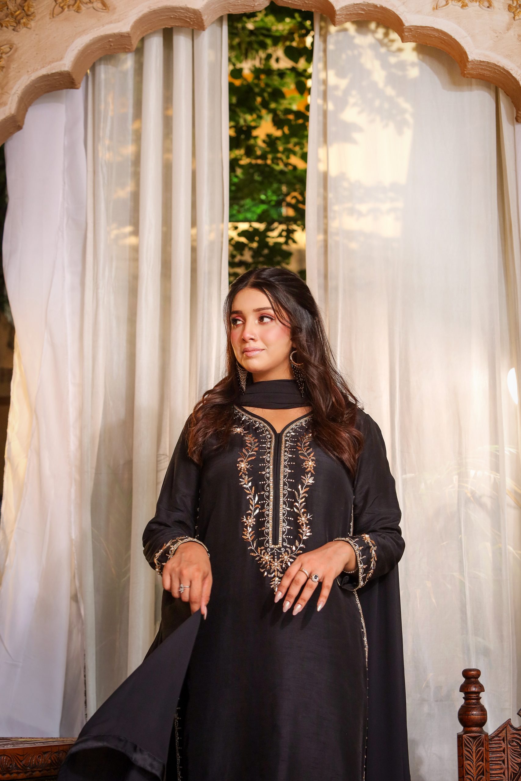 A luxurious Pure Korean Raw Silk 3-piece suit, handcrafted with exquisite Ada work and elegant Mukesh detailing, completed with a pure silk dupatta.