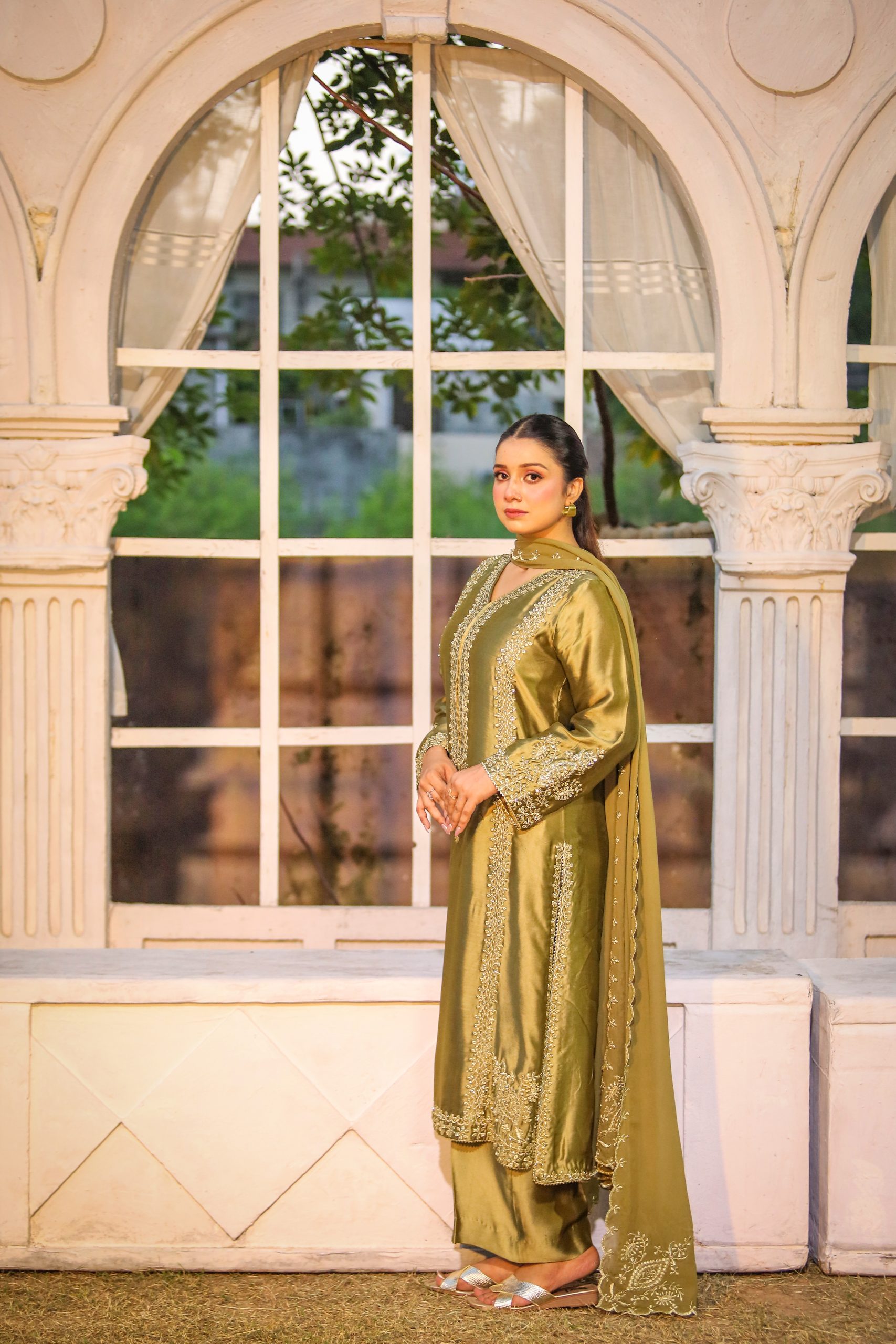A stunning Sheesha Silk ensemble featuring intricate Tilla work and delicate hand embellishments, paired with a graceful Shafoon Dupatta with four-side border. Perfect for weddings and festive occasions.